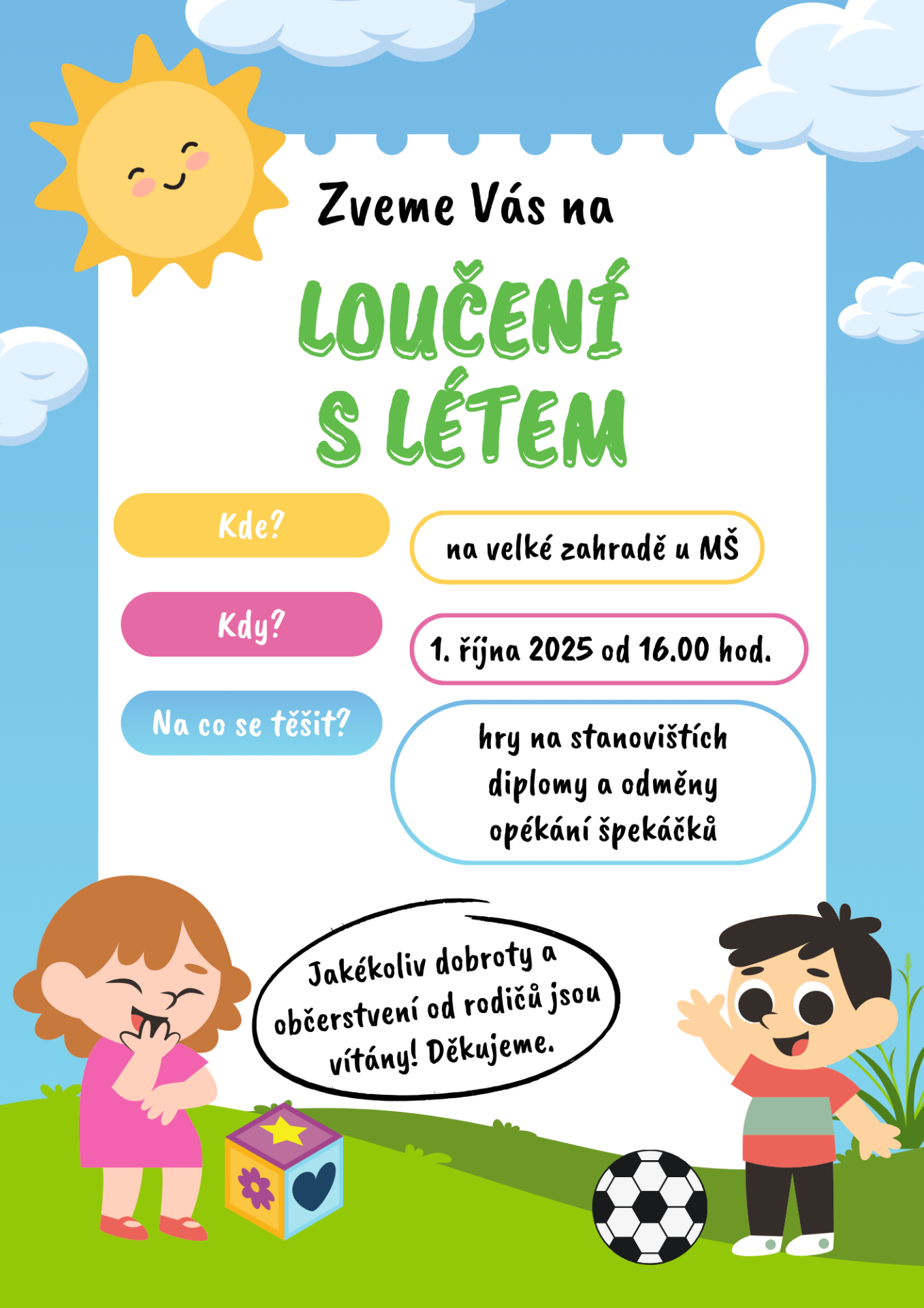 rádi bychom Vás pozvali na náhradní termín zahradní slavnosti, kde se společně rozloučíme s létem. Slavnost se uskuteční ve středu 1. října 2025 na velké zahradě od 16.00! hod.