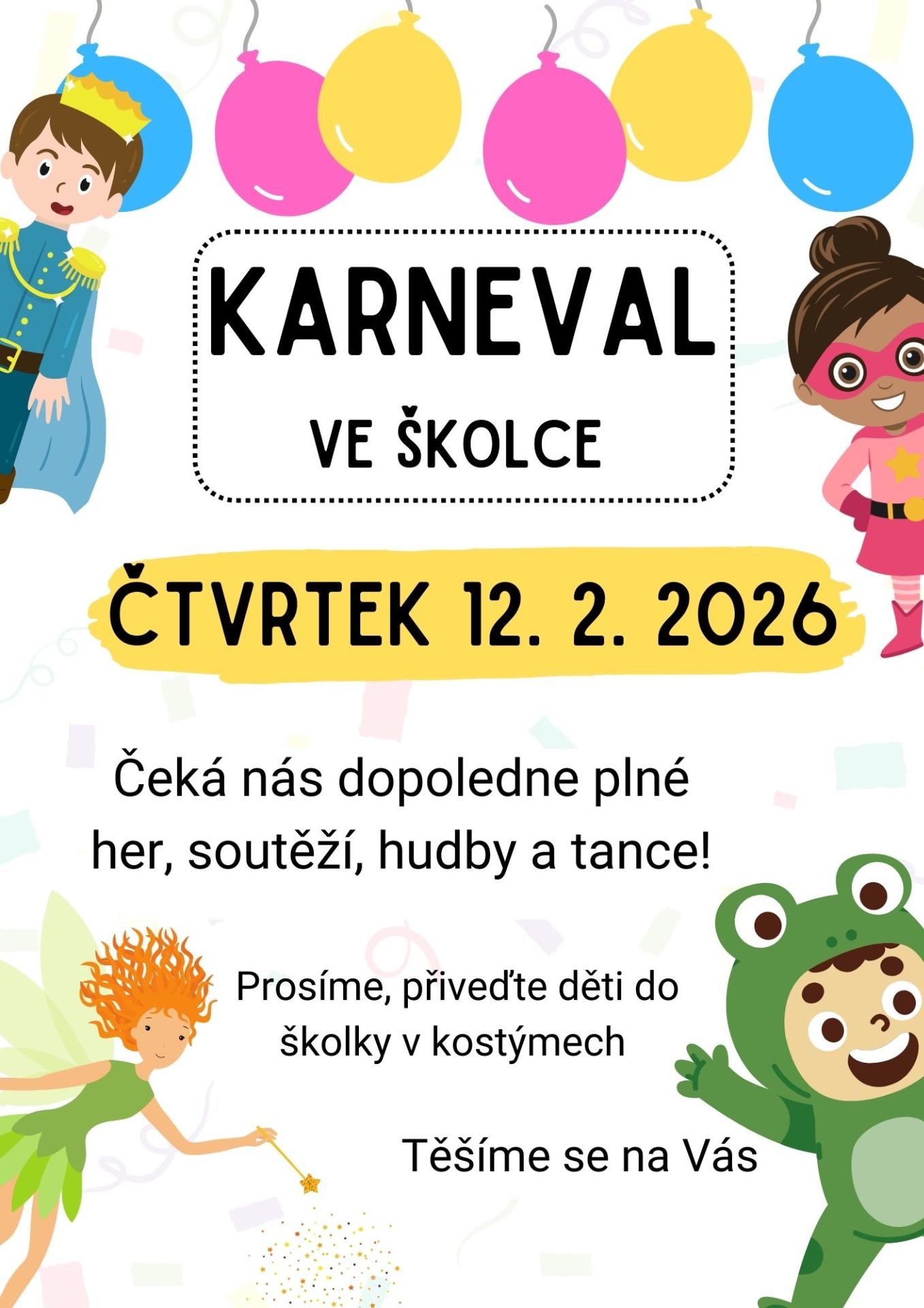 Ve čtvrtek 12. února 2026 si v naší mateřské škole uspořádáme karneval. Výběr kostýmů necháváme tento rok na vás. Prosíme, aby součástí kostýmu nebyly žádné zbraně.