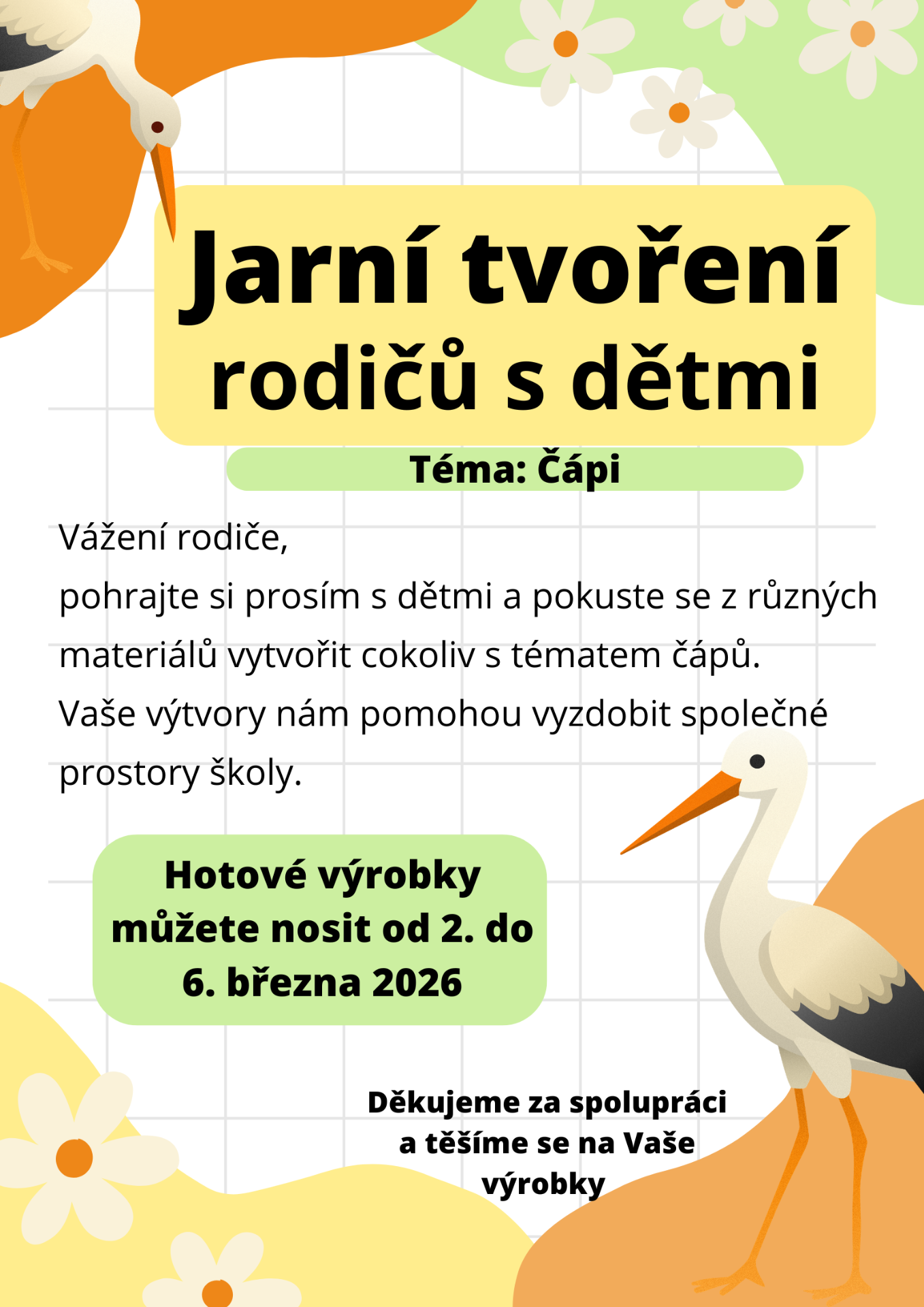 Letošní téma jsou ČÁPI. Prosíme, pohrajte si doma s dětmi a vytvořte jakékoliv výrobky s tímto tématem.