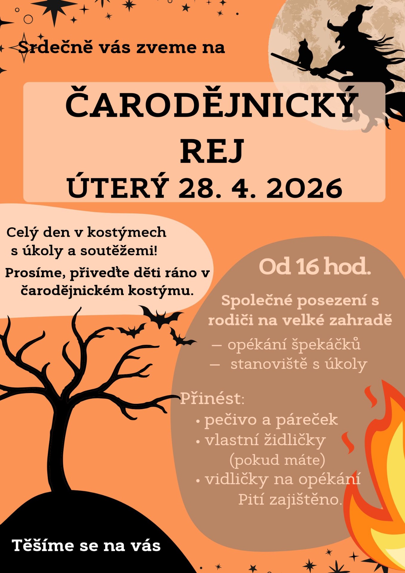 zveme vás na ČARODĚJNICKÝ REJ v úterý 28. 4. 2026. Dopoledne budou probíhat hry a soutěže pro děti. Prosíme, přiveďte děti již oblečené do kostýmů.